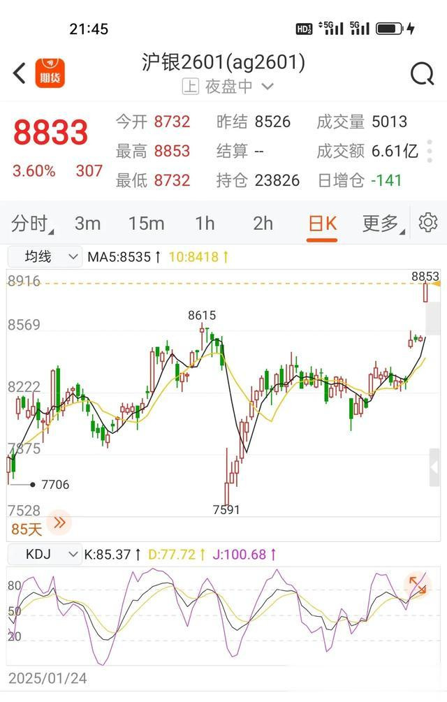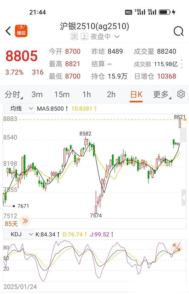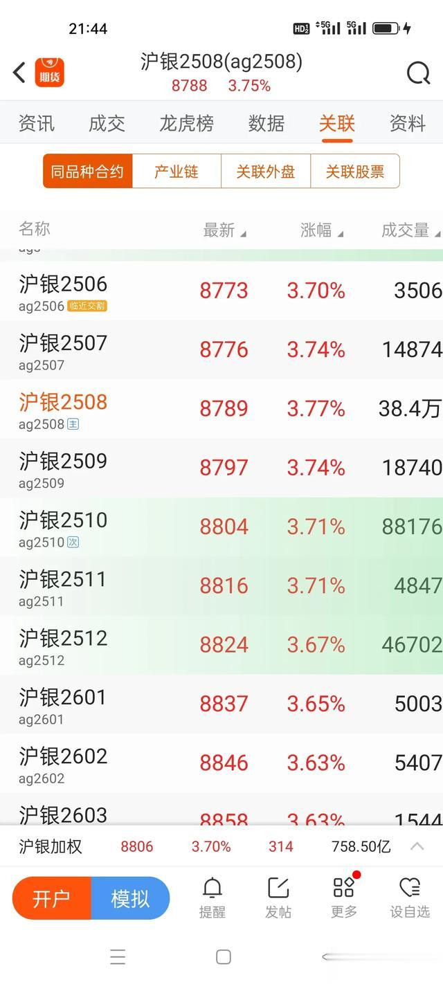 沪银2510从跳空的7574一路狂奔,不觉已上8805,沪银2601从7591跳跃前行,期价冲上8833.